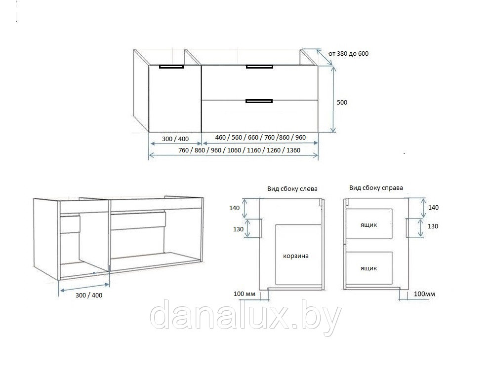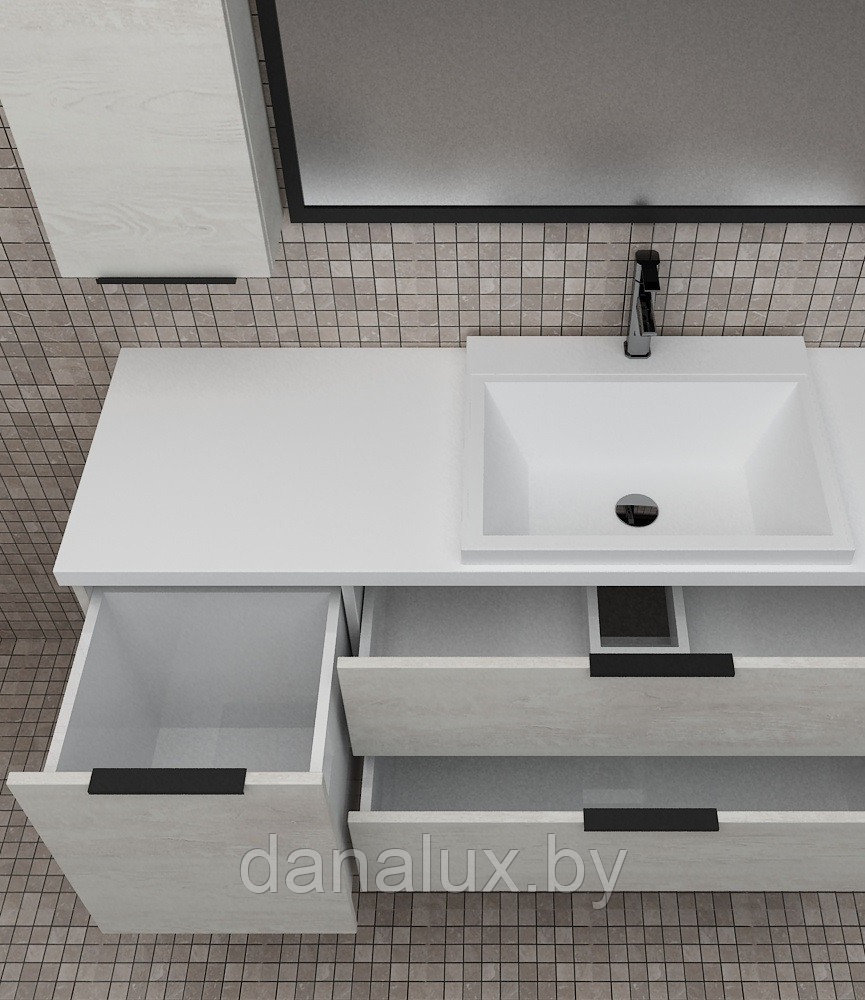 функционал: подвесная тумба, 3 выдвижных ящика с плавным ходом и закрыванием (доводчики нижнего монтажа - Boyard), боковой ящик можно использовать как корзина для белья.