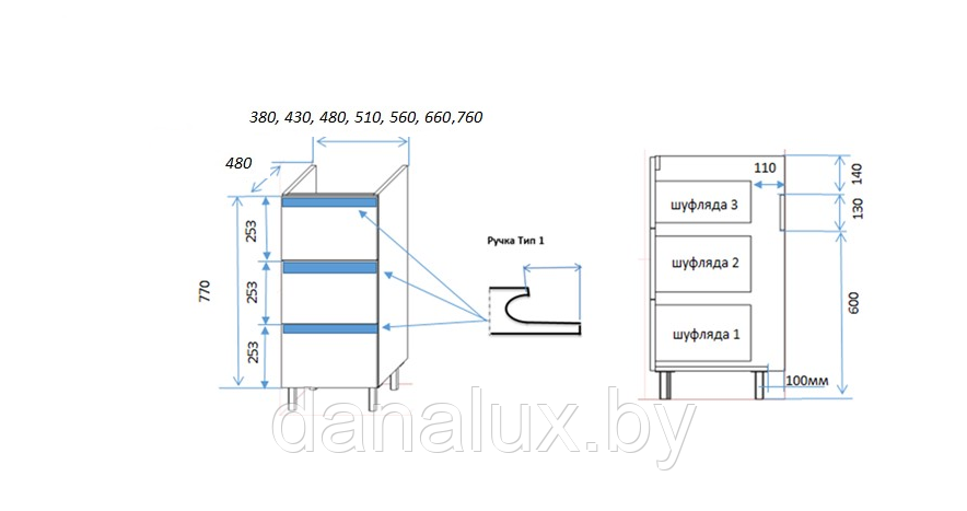 функционал: напольная тумба с регулируемыми ножками, 3 выдвижных ящика с плавным ходом и закрыванием (доводчики нижнего монтажа - Boyard)