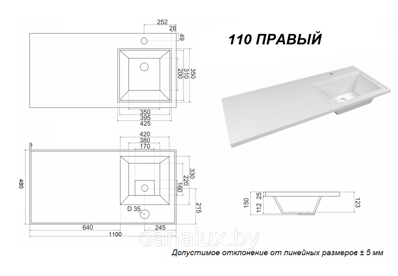 При производстве изделий из литьевого мрамора допустимое отклонение линейных размеров -+ 5мм.