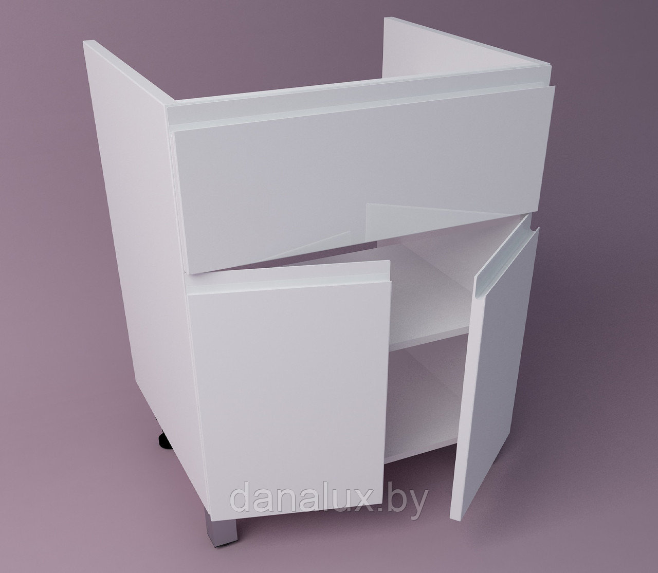 функционал: напольная тумба с регулируемыми ножками, 1 выдвижной ящик с плавным ходом и закрыванием (доводчики нижнего монтажа - Boyard), две распашные дверцы (с плавным ходом и закрыванием).
