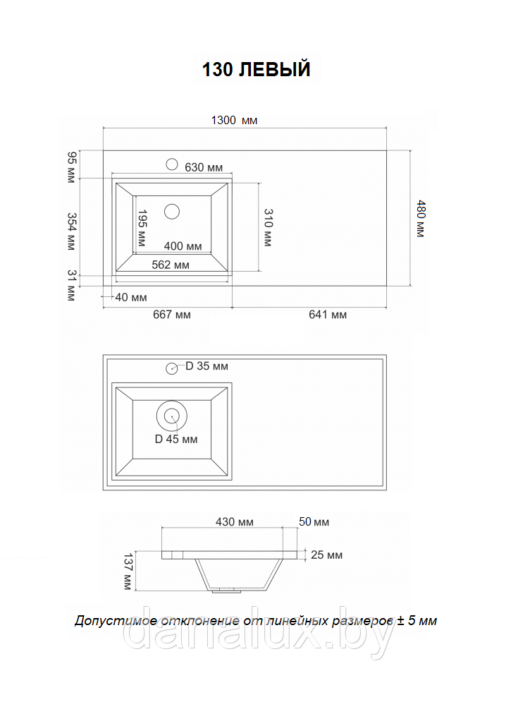 При производстве изделий из литьевого мрамора допустимое отклонение линейных размеров -+ 5мм.