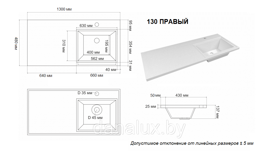 При производстве изделий из литьевого мрамора допустимое отклонение линейных размеров -+ 5мм.