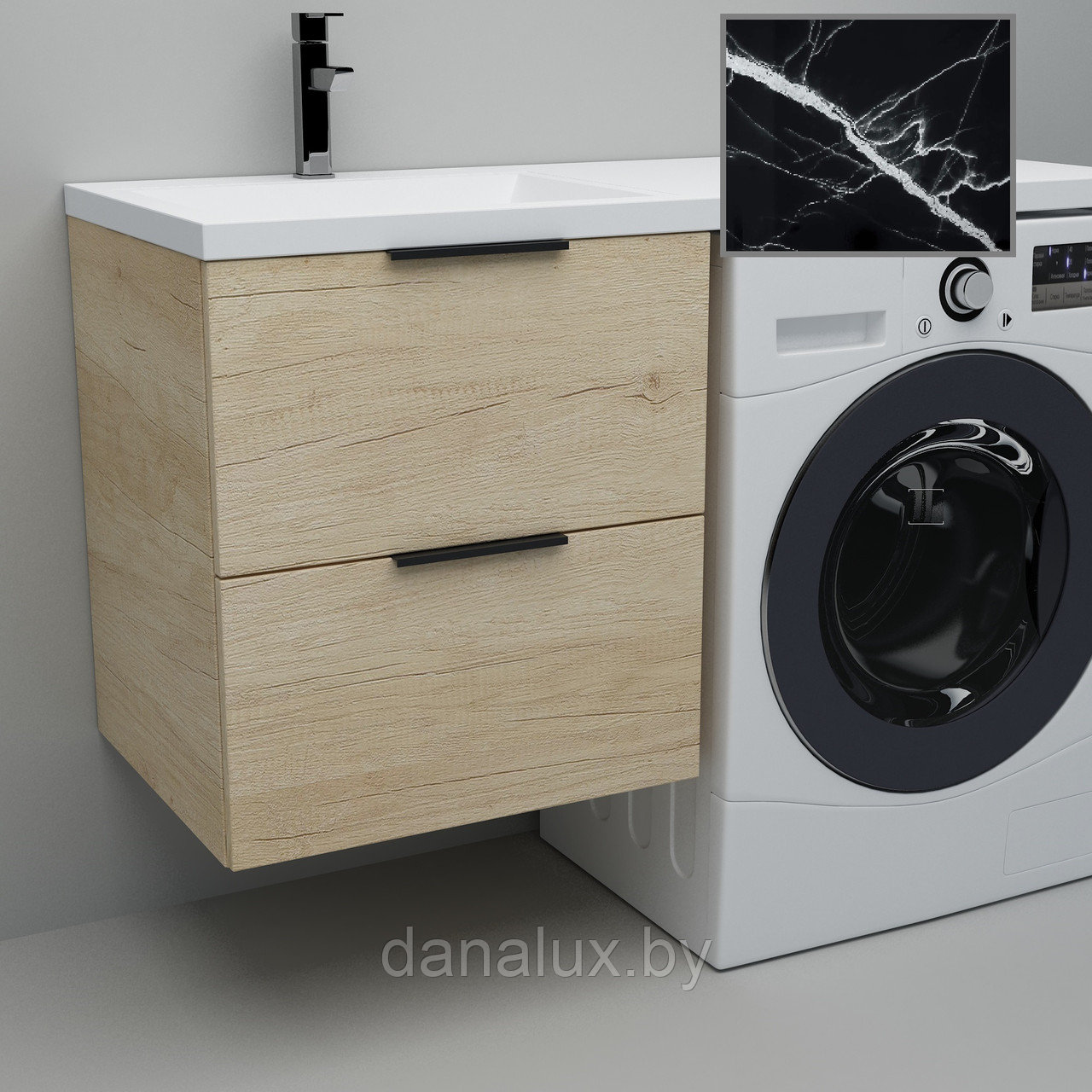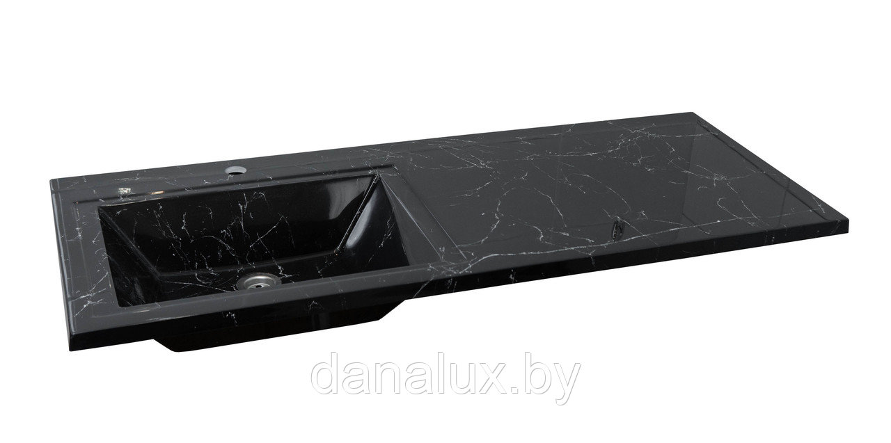 Тумба с умывальником Дана Каскад Люкс 130 подвесная на 2 ящика (чаша слева) цвет дуб/черный мрамор