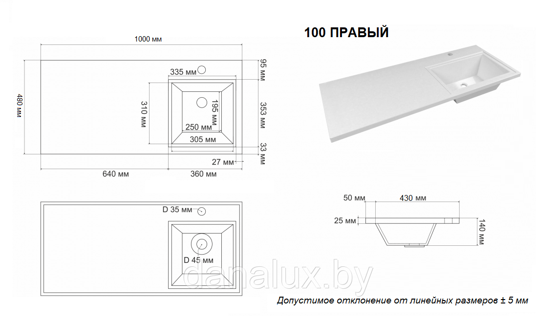 При производстве изделий из литьевого мрамора допустимое отклонение линейных размеров -+ 5мм.