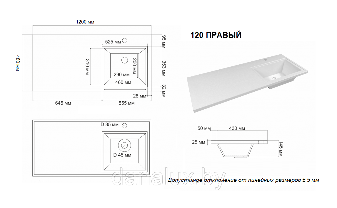 При производстве изделий из литьевого мрамора допустимое отклонение линейных размеров -+ 5мм.